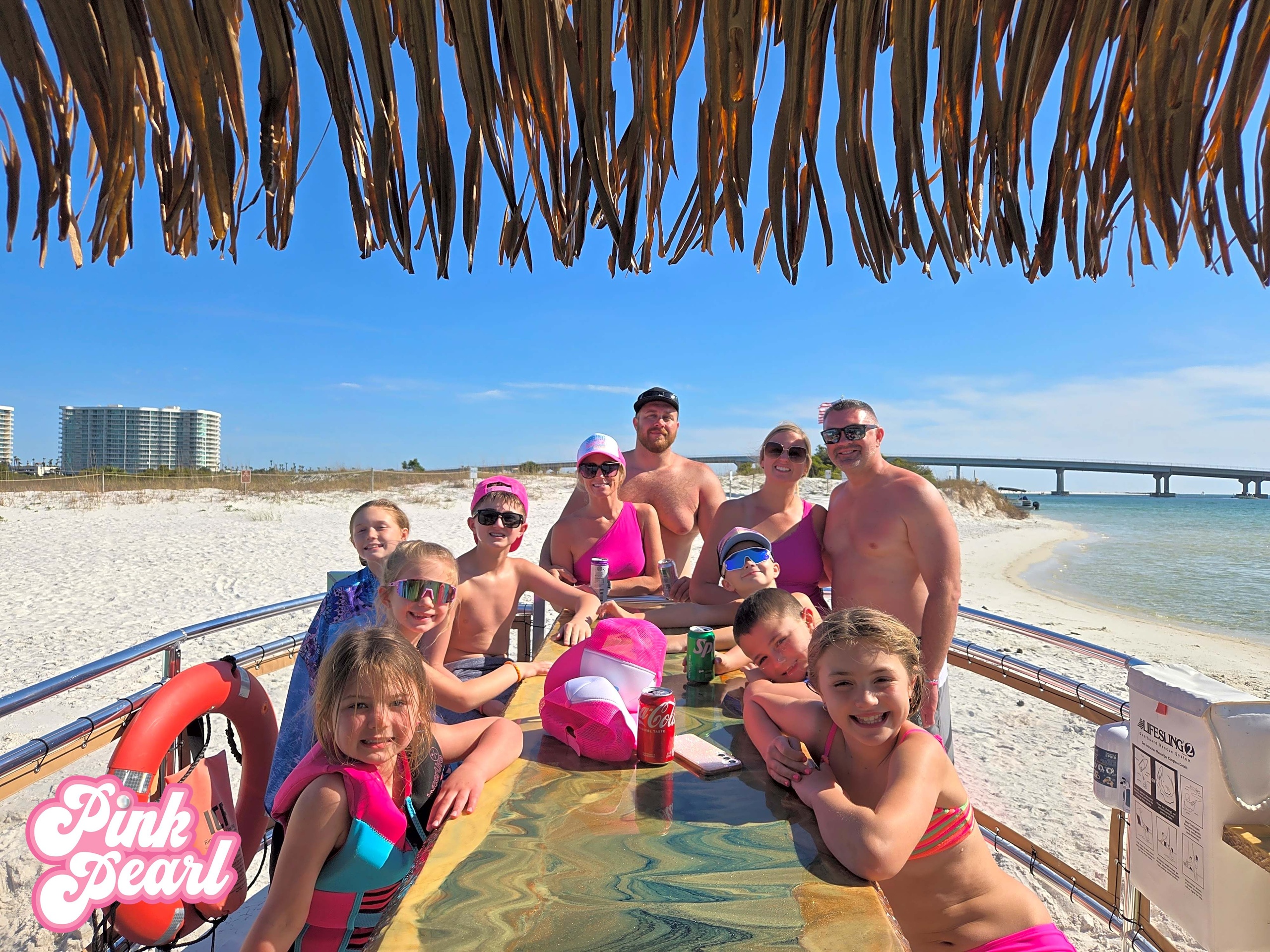 The Pink Pearl is rated for 18 passengers (average 185 pounds) or 3,330 lbs plus the Captain and Crew! We have bar seating for 12 and the lounge couches in the stern, so there is seating for everyone.